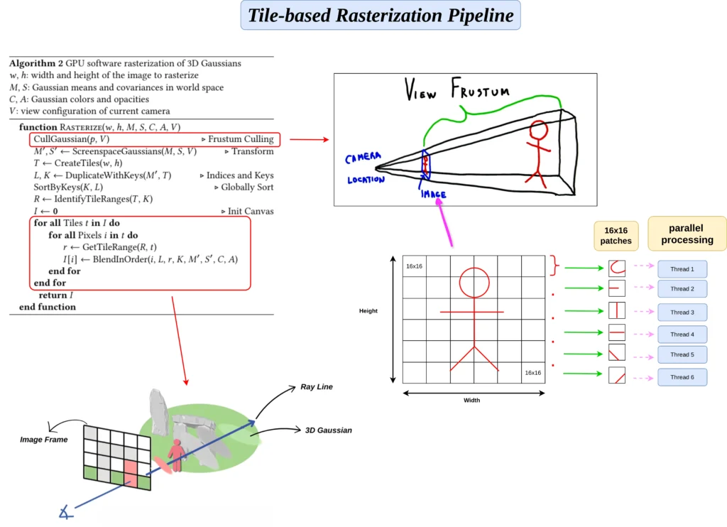 - Tile-Based Rasterization: Efficient GPU-based rendering is achieved by culling, sorting, and processing Gaussians in parallel within screen-space tiles.
