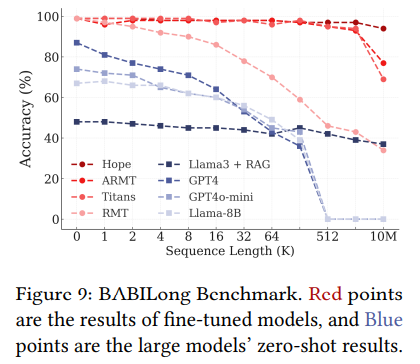In these tests, standard Transformers – even when augmented with RAG (Retrieval-Augmented Generation) – show a sharp “performance cliff.” Once the sequence length crosses 256K tokens, their logic begins to unravel. HOPE, by contrast, shows a “flat line” of success. Whether the document is 1,000 words or 10,000,000 words, HOPE’s ability to categorize and store information in its CMS levels enables it to perform high-level reasoning previously reserved for humans reading a multi-volume series of books.