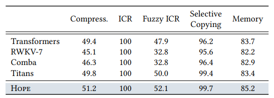 On the MAD (Mechanistic Analysis and Design) benchmark, HOPE actually outperformed standard Transformers in Fuzzy Recall (52.1% vs 47.9%). This suggests that HOPE’s self-referential updates enable it to capture the essence and meaning of information rather than just its literal characters. It doesn’t just “remember” the text; it “understands” it deeply enough to retrieve it even when the prompt is slightly vague or different from the source.
