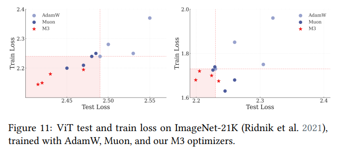 • Vision Tasks (ImageNet-21K): When training Vision Transformers (ViT), M3 achieved significantly lower Test Loss and Train Loss than its competitors. In AI, this is known as “better generalization”—the model didn’t just memorize the data; it actually understood the underlying patterns better.
