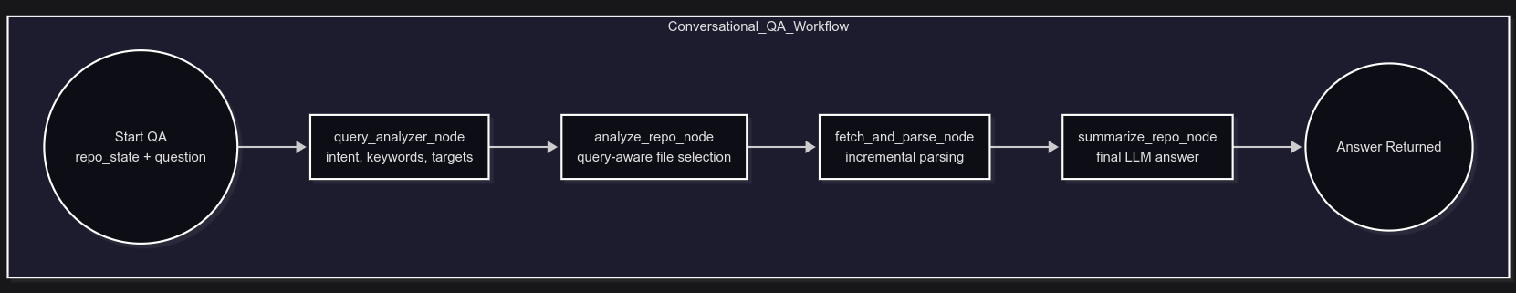 Instead of manually searching through files, the system analyzes the repository structure, parses only the relevant files as needed, and produces clear answers.