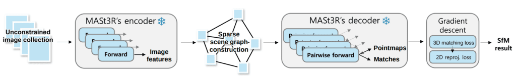 Although DUSt3R provides a good estimate with just a single forward pass eliminating the need for all complex pipelines in traditional SfM, it gives imprecise global SfM reconstruction. Similarly MASt3R while specifically trained for matching image pairs and it doesn’t scale well for larger scenes.