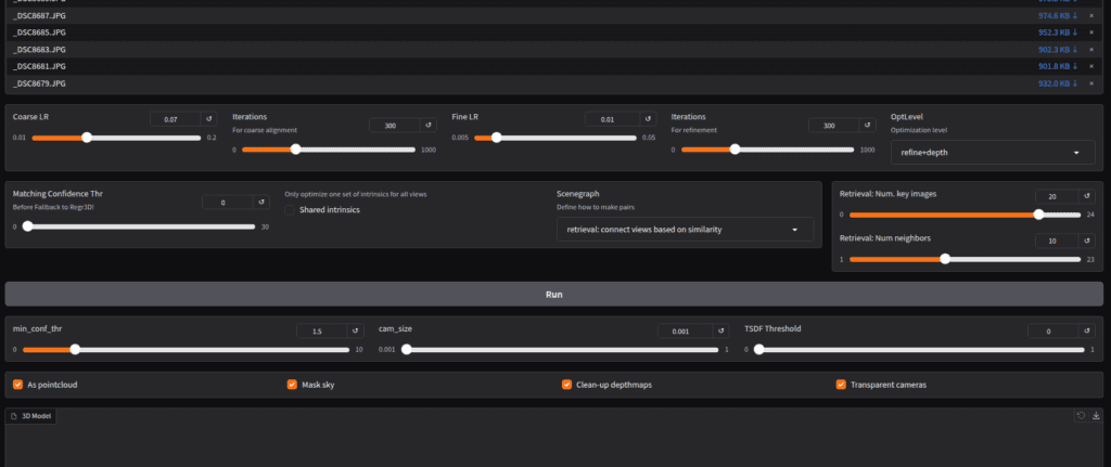 Similar to DUSt3R, MASt3R also has scene graph optimization strategy approaches, such as one-ref, swin or log-win, retrieval. For MASt3R-SfM we will use scene graph strategy of “retrieval: connect views based on similarity” which will fetch the top_k reference images. The codebook.pkl file contains a set of visual descriptors used for image representations to facilitate the matching process.